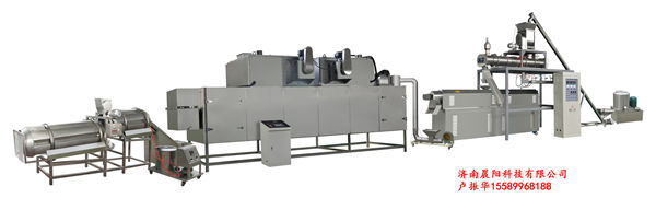 干法生產(chǎn)線:拌粉機(jī)-螺旋輸送機(jī)-膨化機(jī)-風(fēng)送機(jī)-烘干機(jī)-批次稱重式調(diào)味混合機(jī)