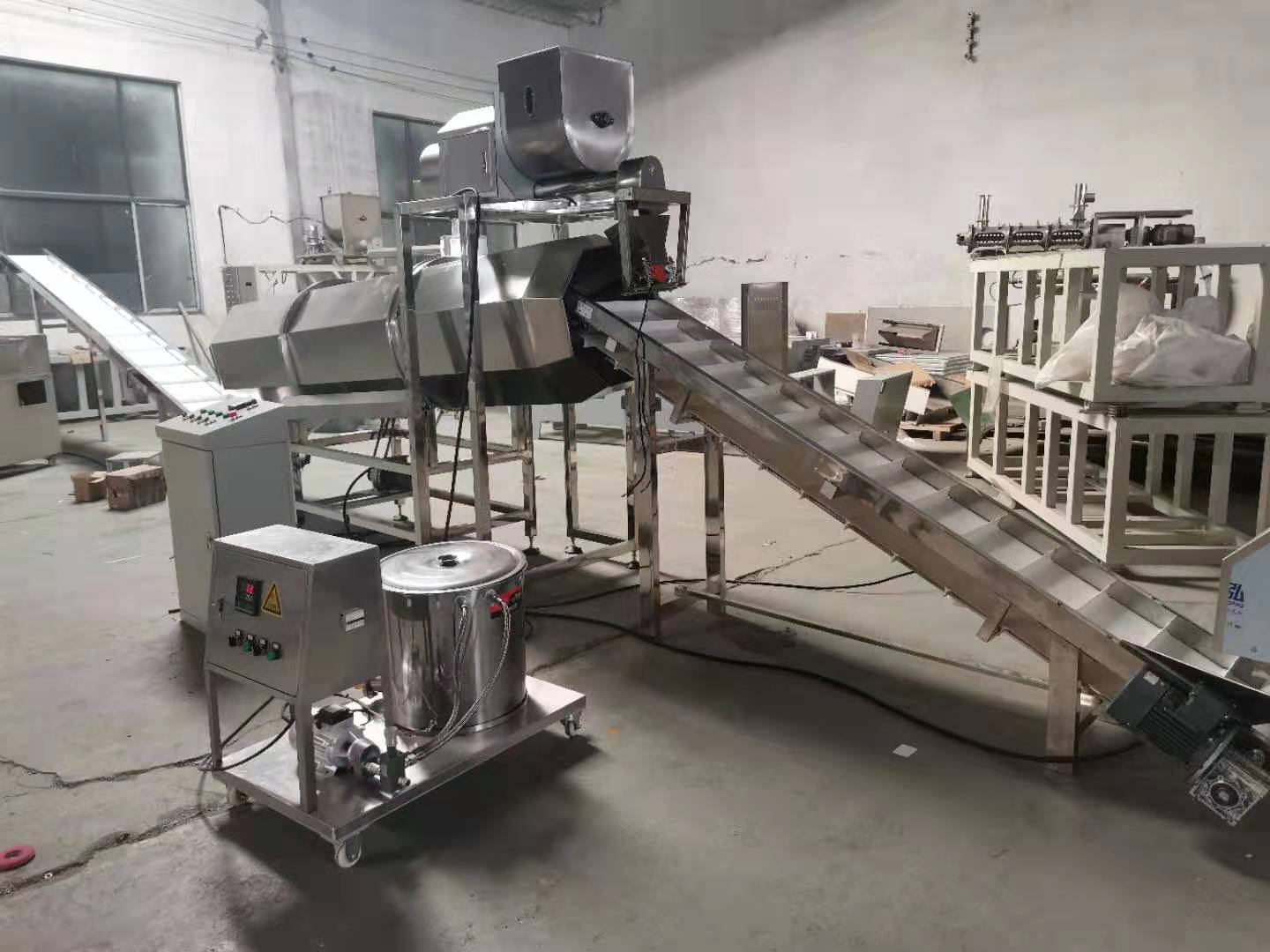8、噴油調(diào)味機:產(chǎn)品經(jīng)烘烤后,經(jīng)過噴油調(diào)味機實現(xiàn)便面的連續(xù)噴油撒粉混合。調(diào)味設(shè)備有八角調(diào)味機、單滾筒調(diào)味機、雙滾筒調(diào)味機、批次稱重式噴油調(diào)味機。