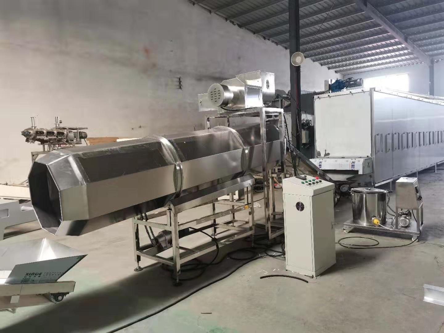 一、工藝流程: 原料配制→拌粉→輸送→擠壓膨化→注芯→整形切斷→輸送→干燥→噴油→調(diào)味→(包裝)