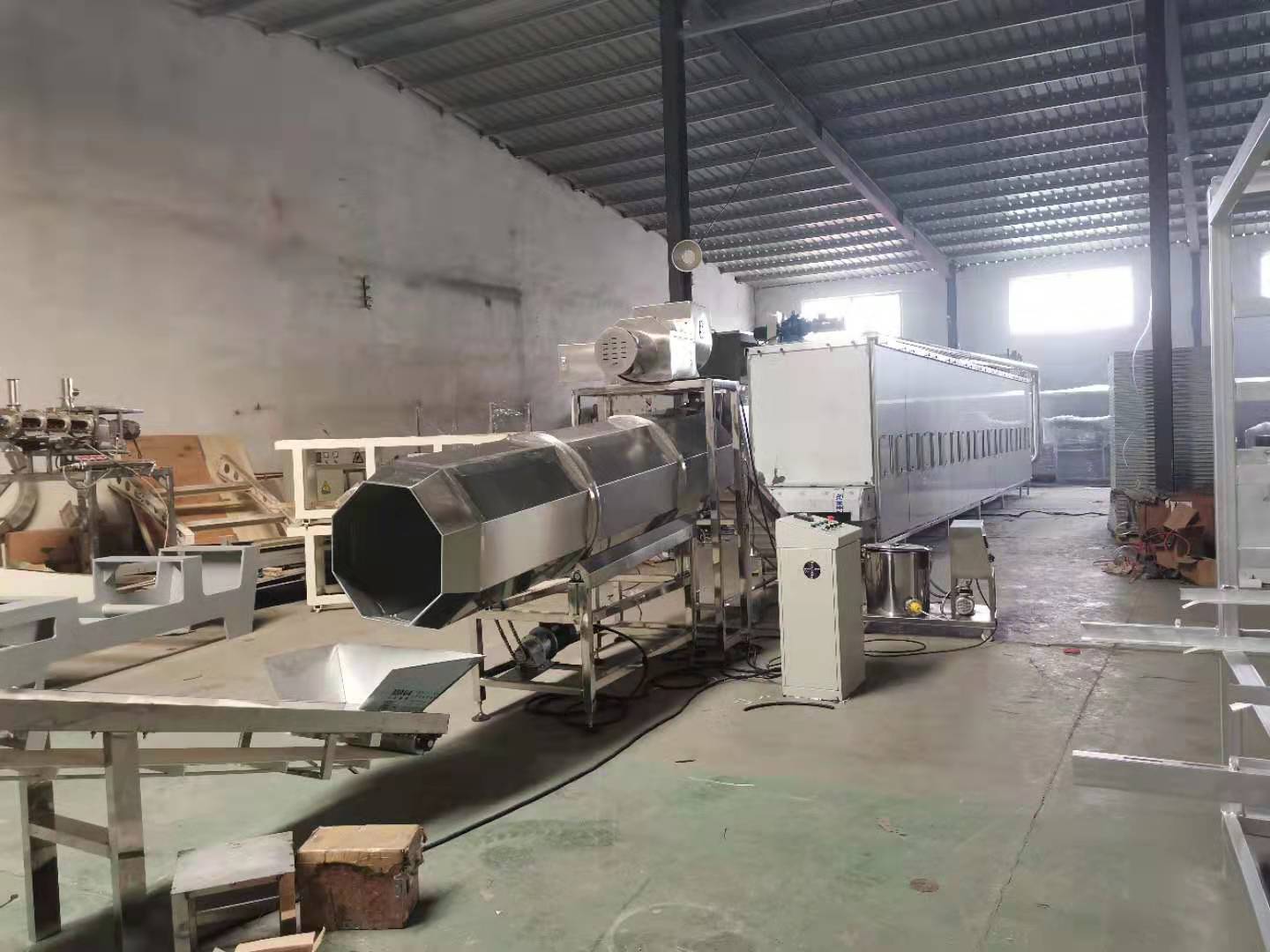 二、設(shè)備配置: 拌粉機→上料機→膨化機→注芯機→整形切斷機→提升機→多層烤箱→提升機→噴油機→滾筒→(包裝機)