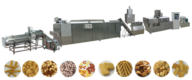 5.谷物膨化與夾餡:這是產(chǎn)品生產(chǎn)的關(guān)鍵工序,物料膨化的好壞直接影響zui后的質(zhì)感和口感,物料在擠壓中經(jīng)過(guò)高溫,高壓成為流動(dòng)性的凝膠狀態(tài),通過(guò)特殊設(shè)計(jì)的夾心模均勻穩(wěn)定地?cái)D出完成膨化,同時(shí)餡料通過(guò)心機(jī)擠壓,經(jīng)過(guò)夾心模均勻地注入膨化酥中,隨膨化物料一同擠壓出來(lái),擠出時(shí),物料水分降至9%-10%.