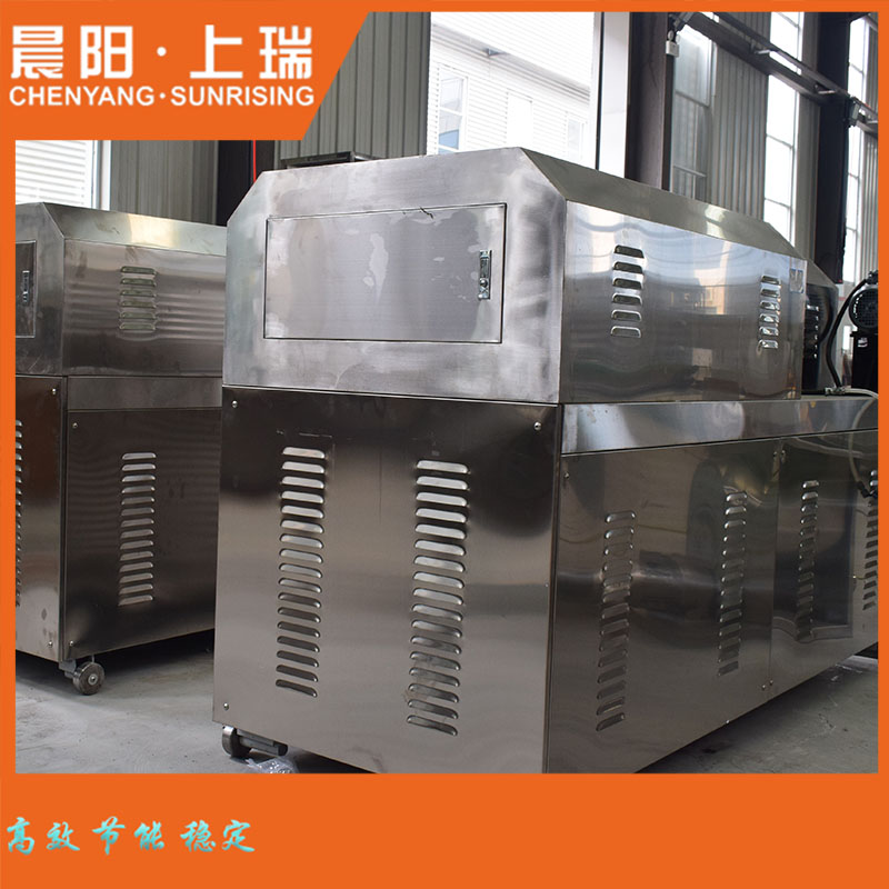 反向旋轉(zhuǎn)雙螺桿擠壓膨化機(jī)一般采用兩根尺寸完全相同,但螺紋方向相反的螺桿。向內(nèi)旋轉(zhuǎn)和向外旋轉(zhuǎn)的區(qū)別在于壓力區(qū)的位置不同,雙螺桿向內(nèi)旋轉(zhuǎn)產(chǎn)生的壓力為上高下低,物料通過雙螺桿時,在入口會產(chǎn)生極高的壓力,造成進(jìn)料困難,這種向內(nèi)反向旋轉(zhuǎn)式很少采用;雙螺桿向外旋轉(zhuǎn)產(chǎn)生的壓力為上低下高,有利于進(jìn)料。但反向旋轉(zhuǎn)與同向旋轉(zhuǎn)相比,物料在螺桿內(nèi)形成的C形物料流不能從一根螺桿移向另一根螺桿,物料產(chǎn)生的混合程度顯著降低,其自潔能力也沒有同向旋轉(zhuǎn)雙螺桿有效和穩(wěn)定。