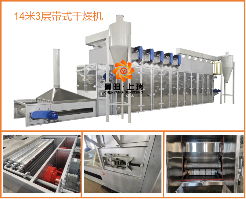 干燥方面,客戶技術(shù)指標(biāo),成品大于2H/h,脫水率:32%降至5%以內(nèi),對(duì)脫水干燥能力具有較高的要求, 晨陽干燥機(jī)本次配置14米3層干燥機(jī),帶寬2米,箱室高度達(dá)2.4米,通風(fēng)對(duì)流效果好,中間段12米,2米一節(jié)。使用不銹鋼鏈板網(wǎng)帶,使用壽命長,鏈板基本上沒有維修率,鏈板沖孔方式使用晨陽設(shè)計(jì)的新技術(shù),透風(fēng)性好,支撐能力強(qiáng),托料能力強(qiáng)。一平方承載22.5-35公斤物料。3層鏈板獨(dú)立變頻調(diào)速,烘干停留時(shí)間30-90分鐘。2段控溫,自動(dòng)比例調(diào)節(jié)閥。蒸汽加熱,使用碳鋼無縫管鋁翅片,散熱好,能源利用高,獨(dú)立變頻的排濕系統(tǒng),濕度數(shù)顯,數(shù)據(jù)化操作。出料端設(shè)計(jì)3米強(qiáng)制冷卻段,迅速降低顆粒表面溫度。確保在后端噴涂前工藝緩沖倉不會(huì)因溫度過高產(chǎn)生熱汽結(jié)團(tuán)