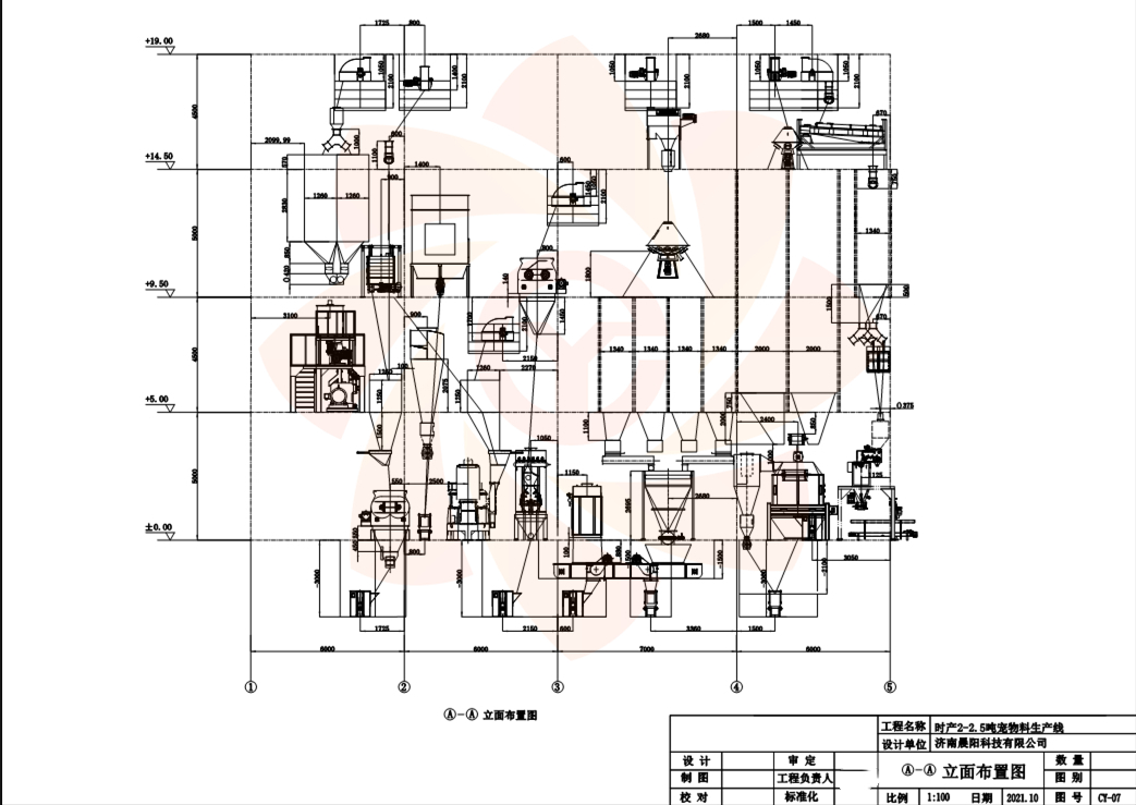 本套2-2.5T/h寵物食品生產(chǎn)線工藝特點(diǎn),因客戶是空地建設(shè),我司設(shè)計(jì)首先考慮工藝流程的順暢,在設(shè)計(jì)上人性化布局,采用4層鋼結(jié)構(gòu)設(shè)計(jì),車間建設(shè)高度19米(因客戶政府高度限制),工藝方面使用國內(nèi)主流二次混合,二次粉碎、雙螺桿膨化機(jī)、真空噴涂、逆流冷卻,產(chǎn)品混色,包裝碼垛等全部自動(dòng)流水線。配料倉采用12倉,滿足多種配方配料要求,配料軟件采用布勒系統(tǒng)。配料穩(wěn)定,可儲(chǔ)存多種配方,配料記錄可留檔查詢,原料混合使用雙軸漿葉混合機(jī),混合均勻度≥98%,雙軸混合機(jī)排料殘留低,可保證每批原料的混合均勻度一致,粉碎機(jī)工藝采用粗粉加細(xì)粉,批次粉碎。避免不同原料進(jìn)粉碎機(jī)因過篩問題產(chǎn)生沉降層。粗粉碎使用臥室錘片粉碎機(jī),粉碎細(xì)度20目,產(chǎn)量高。細(xì)粉使用超威粉碎機(jī),刀頭使用鎢合碳化鋼,硬度高。粉碎細(xì)度80目過篩率95%。保證產(chǎn)品成型表面光滑,無凹凸顆粒狀。在二次混合添加微量元素和一定比例油脂,提高產(chǎn)品油脂含量。膨化機(jī)使用雙螺桿膨化機(jī),產(chǎn)品穩(wěn)定,烘干使用帶式低溫干燥,微量元素?zé)釗p低,噴涂使用真空噴涂,油脂添加30%。使用翻板逆流冷卻器,冷卻效果好,配置4倉暫存?zhèn)},可以存儲(chǔ)4種不同顏色的產(chǎn)品,每個(gè)倉存儲(chǔ)可以到6個(gè)小時(shí)膨化產(chǎn)能的產(chǎn)品??梢酝瑫r(shí)四個(gè)顏色進(jìn)行混合,包裝方面配置自動(dòng)打包稱,自動(dòng)碼垛機(jī),給帶式包裝機(jī),包裝規(guī)格500g-25kg全部實(shí)現(xiàn)。