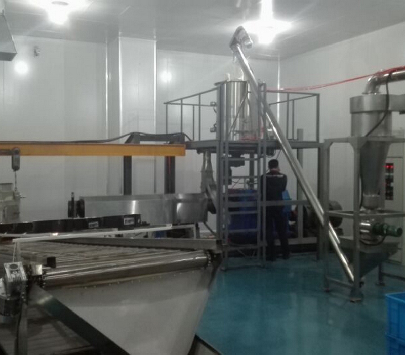 生產(chǎn)線構(gòu)成:拌粉機(jī)→螺旋提料機(jī)→膨化主機(jī)→冷卻輸送機(jī)→除塵粉碎機(jī)