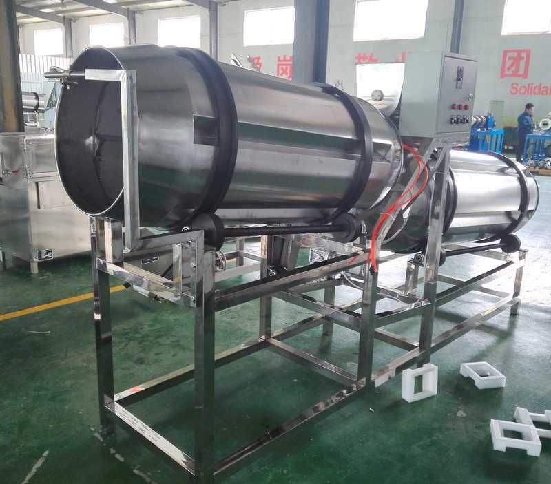 拌粉機→膨化機→提升機-一滾篩-提升機-連續(xù)油炸機-振動脫油機--單滾筒調味機-調味機