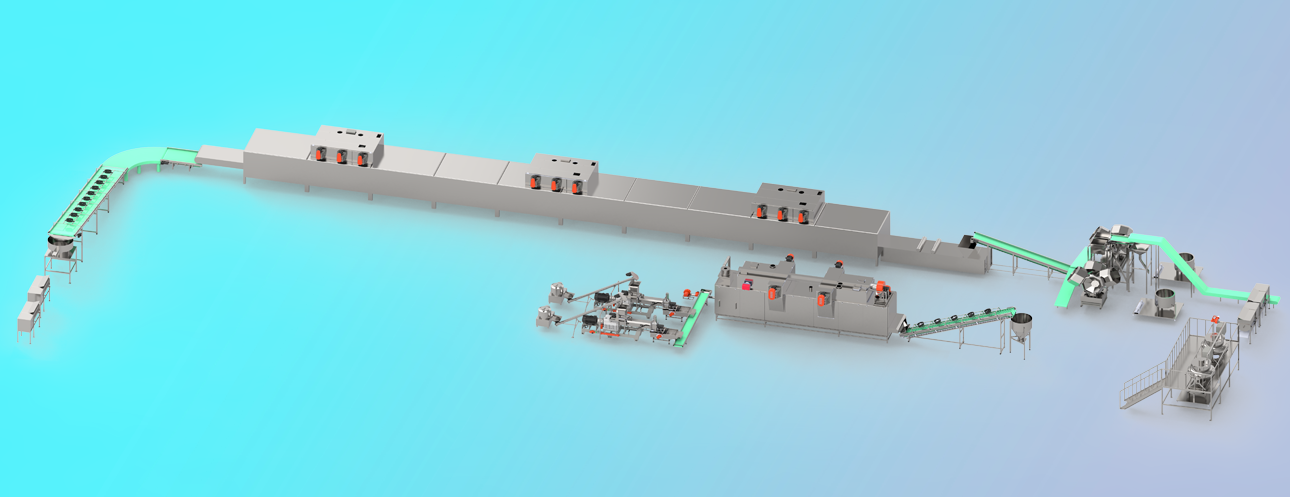 原料混合-擠壓膨化-干燥-冷卻-混合-噴糖-高溫醅烤-冷卻-破碎-包裝