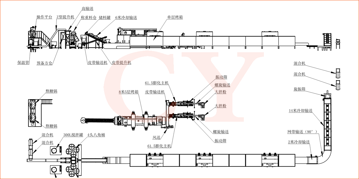 拌粉機(jī)→螺旋提料機(jī)→膨化主機(jī)→提升機(jī)→五層烘干機(jī)→冷卻機(jī)→混合機(jī)→熬糖設(shè)備→噴糖設(shè)備→提升機(jī)→單層高溫烘干機(jī)→冷卻機(jī)→振動(dòng)篩