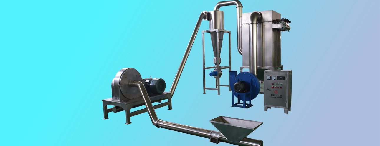自吸進料管道及料斗、粉碎機主機、薩克龍關(guān)風(fēng)機卸料器、箱式除塵器、脈沖器、引風(fēng)機、排風(fēng)管道、控制電柜